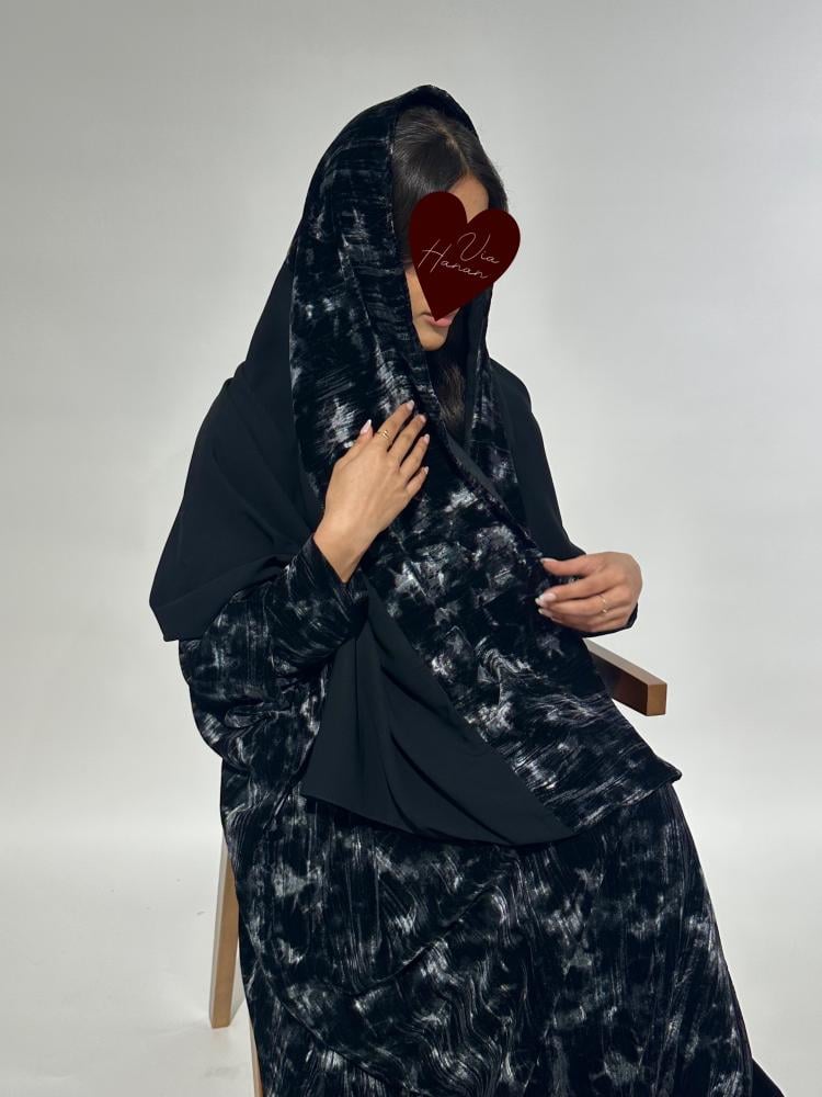عـبـايـة بـقـمـاش مـخـمل بقــصـة البـشـت + طـرحـة نـصـف أسـود نـصـف مـخـمـل